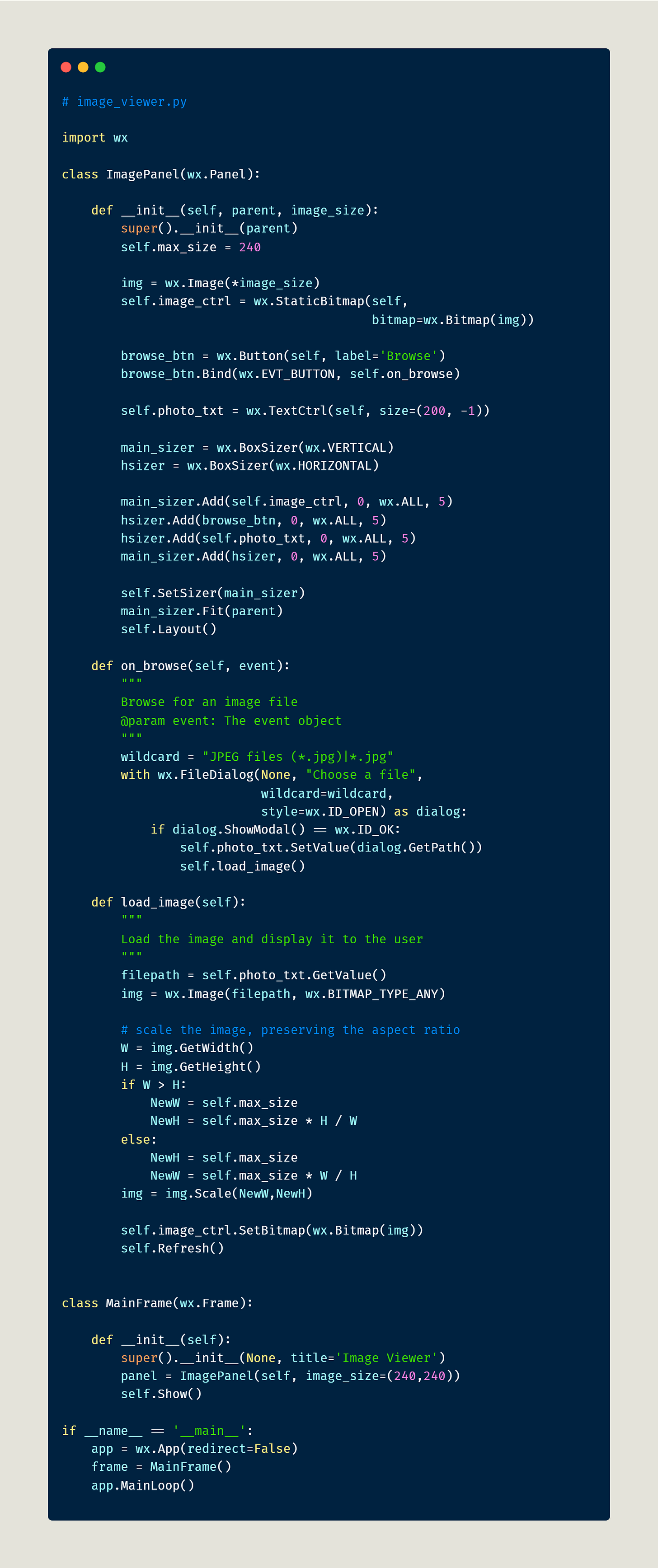 Creating an executable requires code. You can use a simple wxPython application for this tutorial. Here is the image_viewer program code that you can use to open and display images: