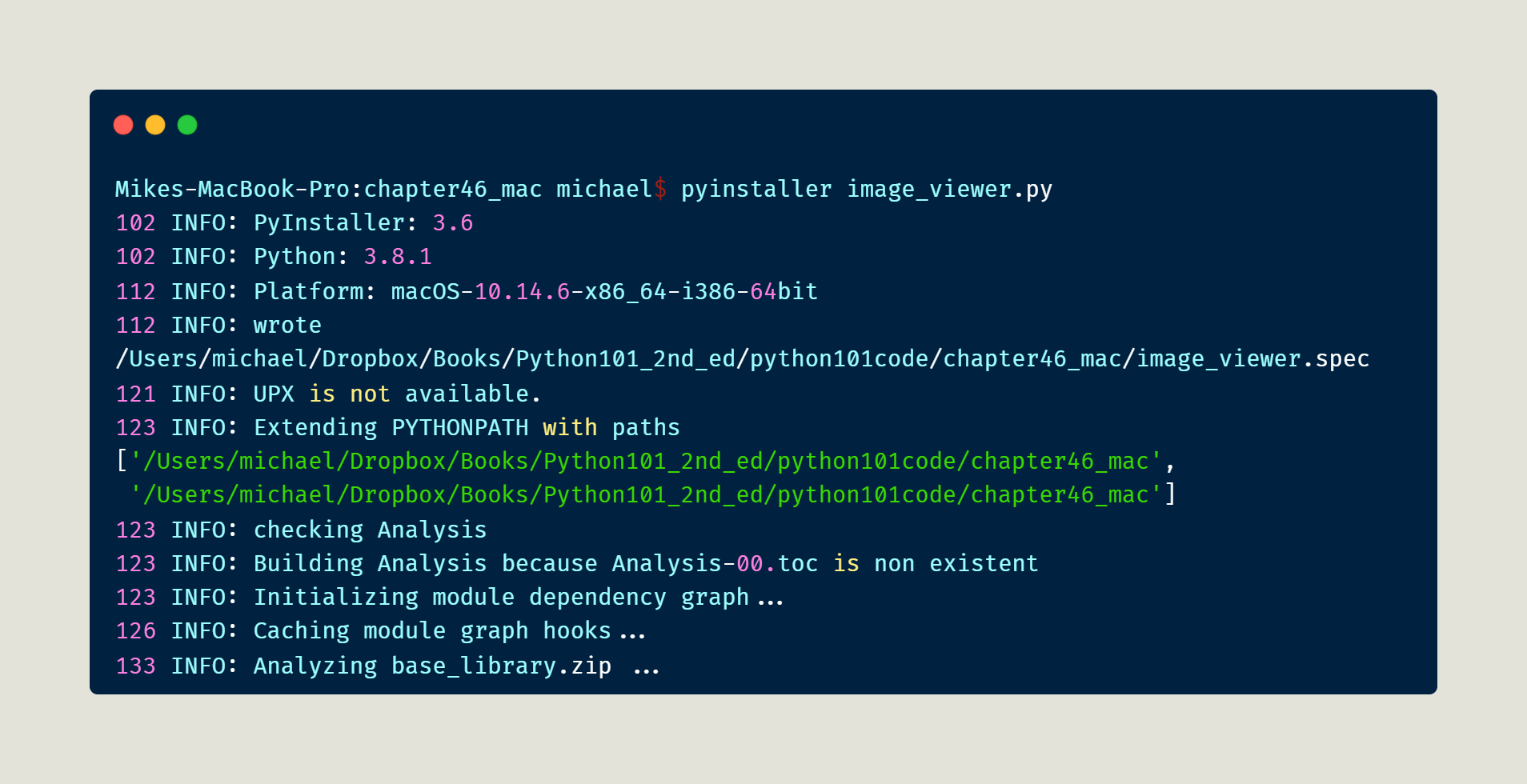 Of course, when you run PyInstaller on a Mac, you will see that the platform information reflects that. When this finishes, you will have a dist folder that contains your app bundle. There does seem to be a bug in Python 3.7 and 3.8 that occurs when you try to launch the app bundle: