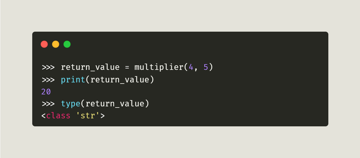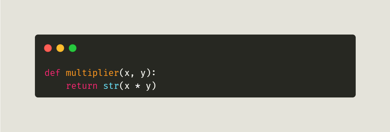 Looking at the code, you would expect a function named multiplier() to take some numeric types and also return a numeric result, and when you print out the result, it looks numeric -- however, it is a string! You will actually run into this issue quite often and it can lead to some weird errors.