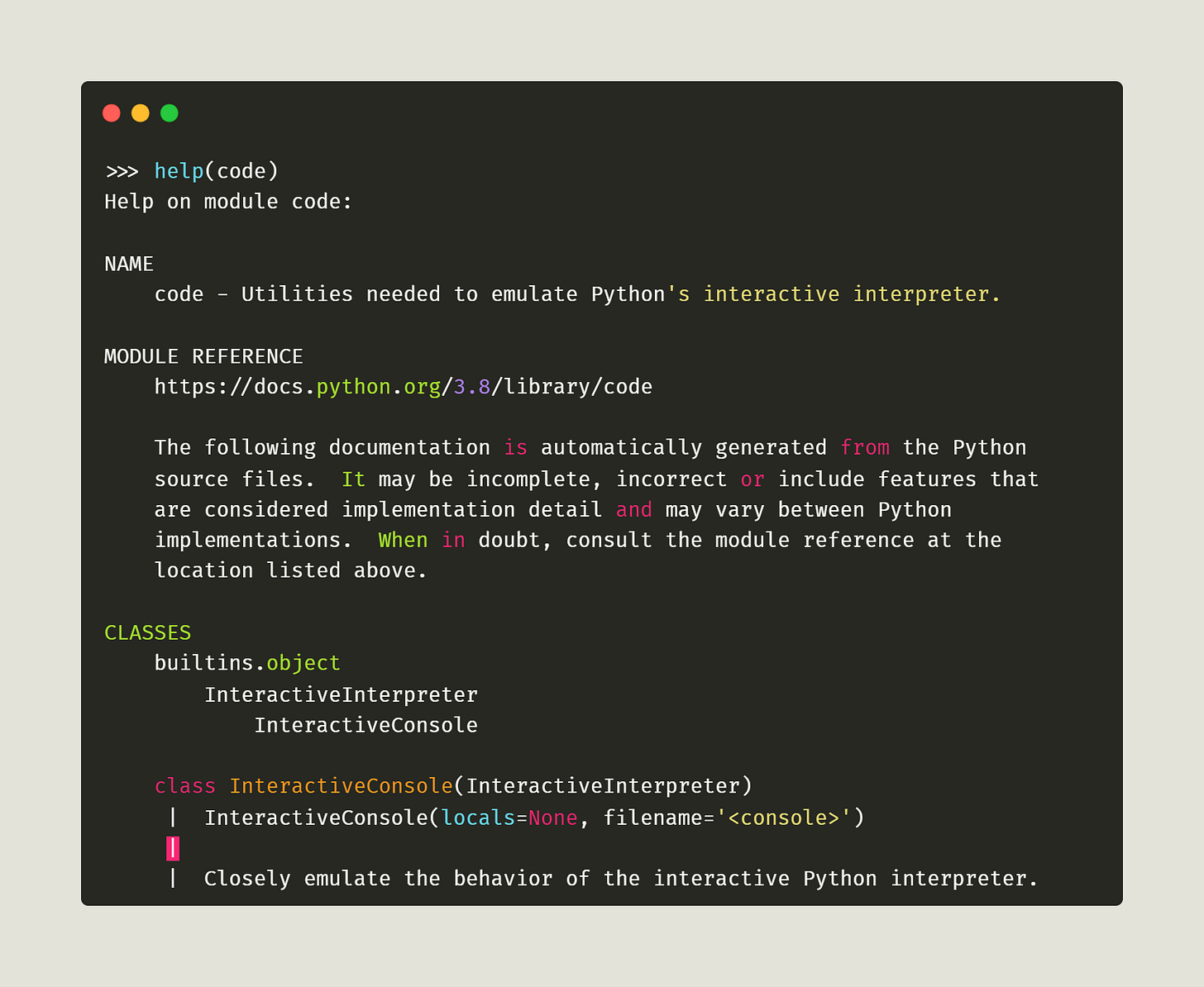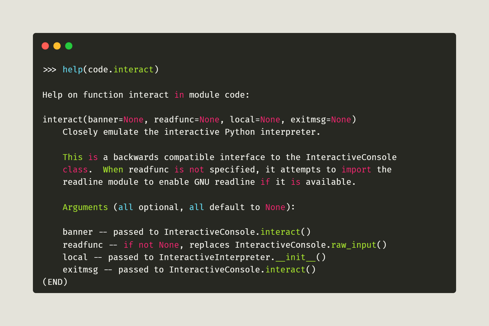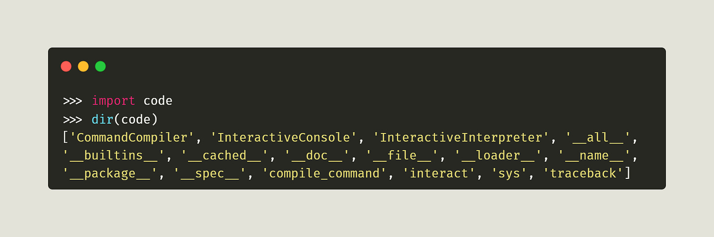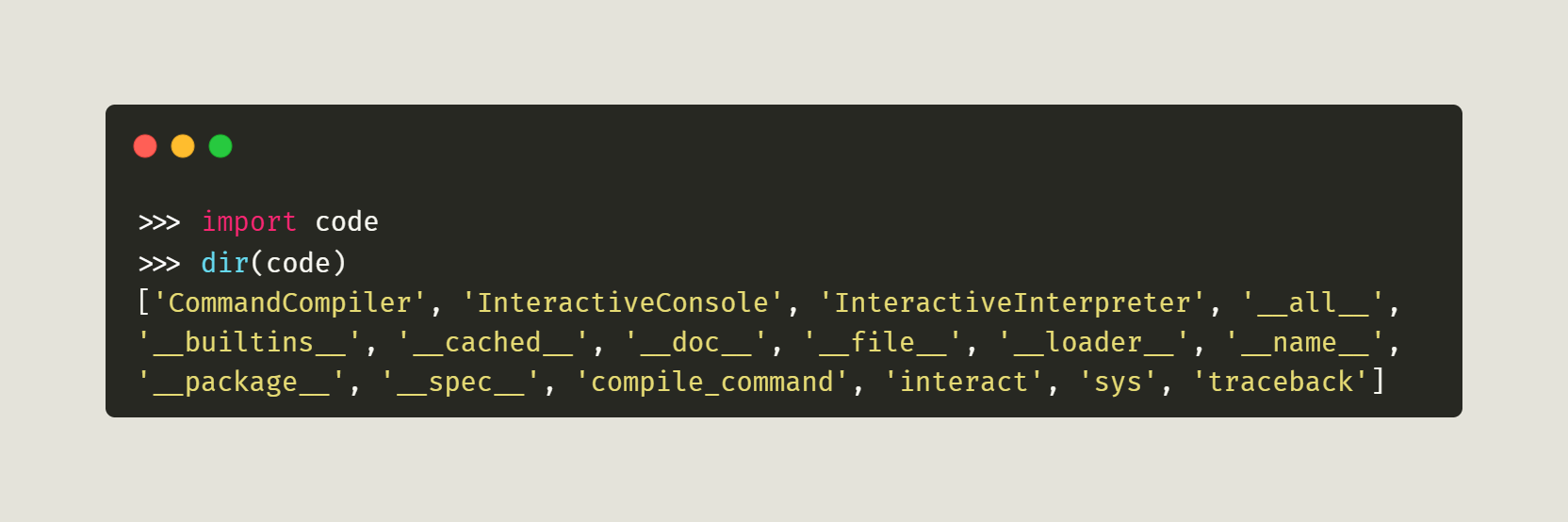 Most people aren’t familiar with the code module. You use it to create read-eval-print loops in Python. One way to learn how you might use this mysterious module is to use the dir() function. Sometimes by reading the module’s function names, you can deduce what it does. In this example, you can see that there is a way to compile_command and interact.