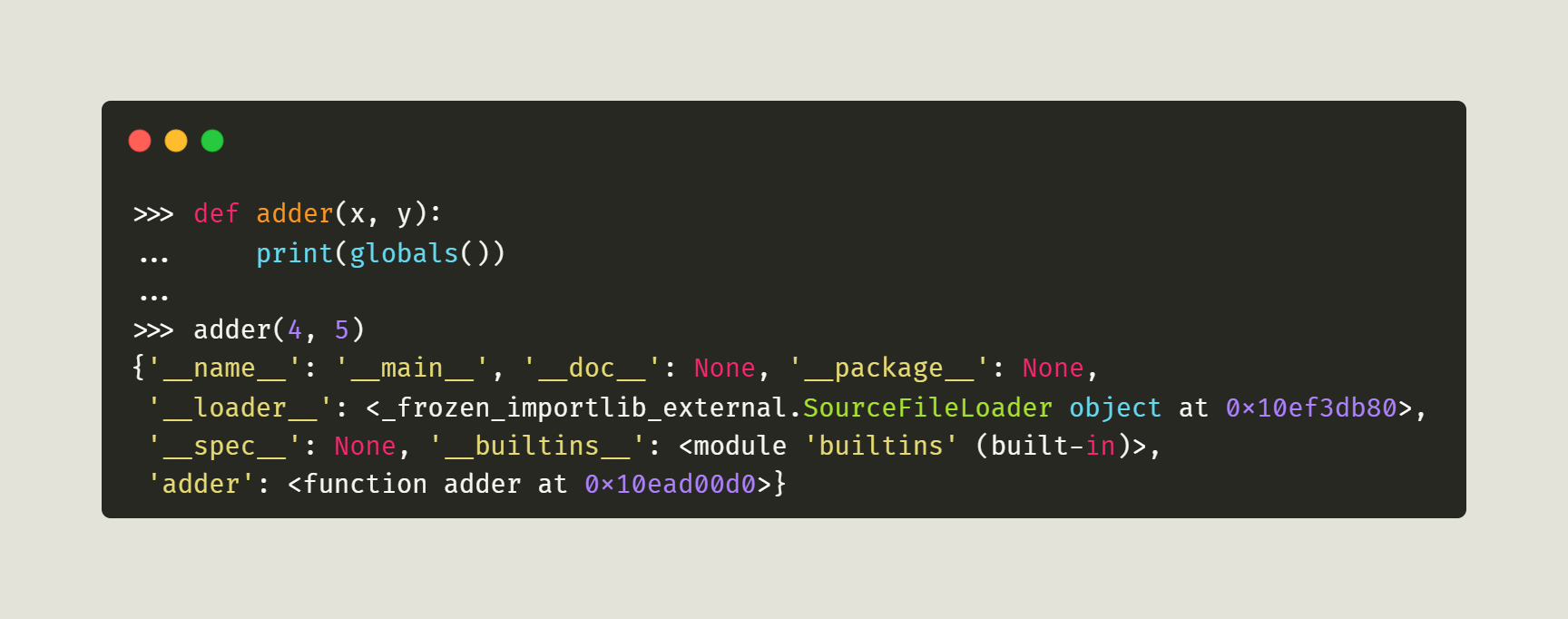 The globals() function is quite similar to the locals() function; the difference is that globals() always returns the module-level namespace, while locals() returns the current namespace. In fact, if you run them both at the module level (i.e., outside of any function or class), the dictionaries that they return will match.