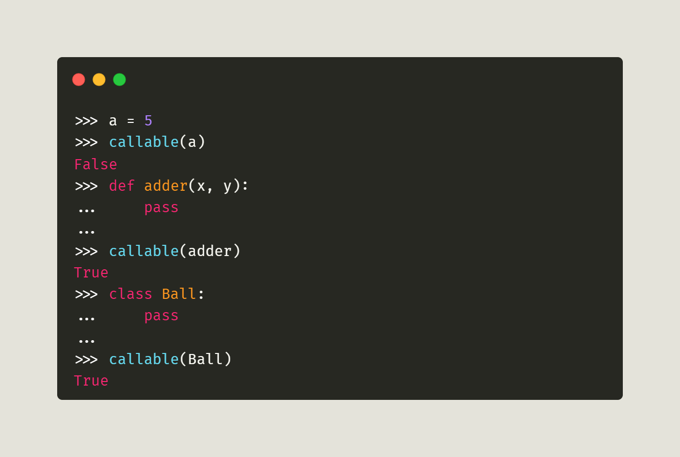 The first example shows that a variable is not a callable object. So you can say with good confidence that the variable, a, is quite probably a variable. The next two examples are testing a function, adder, and a class, Ball, with callable(). Both of these return True because they can both be called. Of course, when you “call” a class, you are instantiating it, so it’s not quite the same as a function.