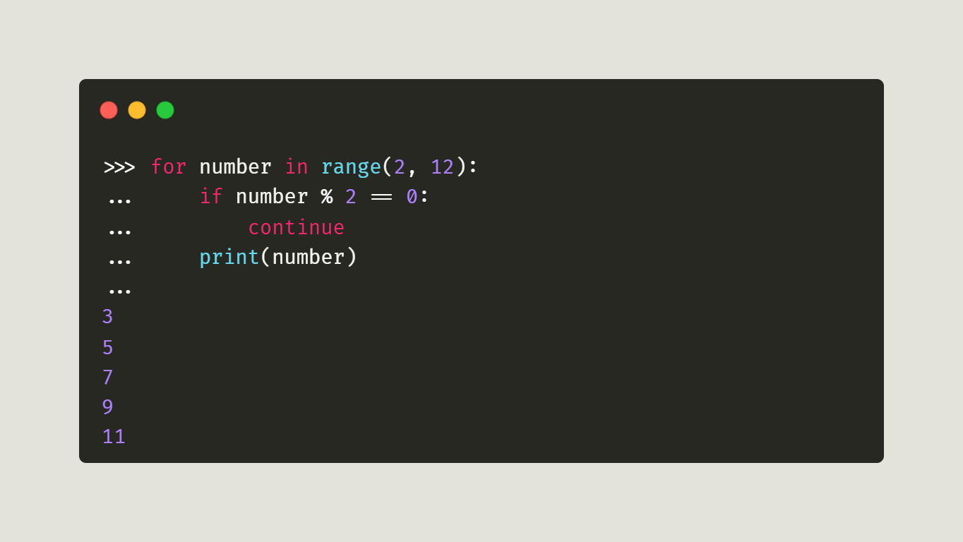 In this code, you loop over a range of numbers starting at 2 and ending at 11. For each number in this range, you use the modulus operator, %, to get the remainder of the number divided by 2. If the remainder is zero, it’s an even number and you use the continue statement to continue to the next value in the sequence. This effectively skips even numbers so that you only print out the odd ones.