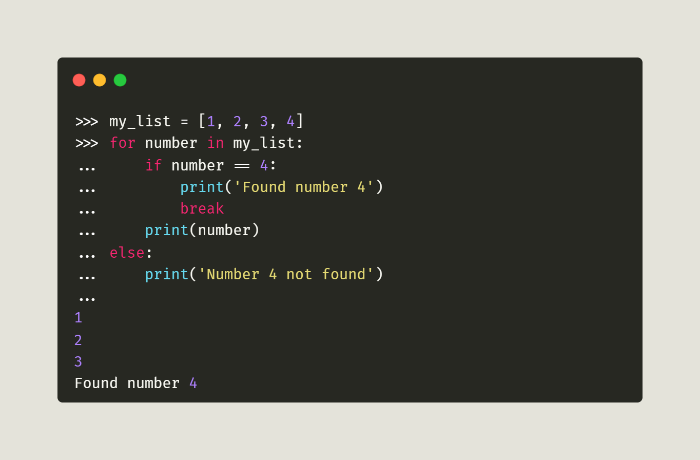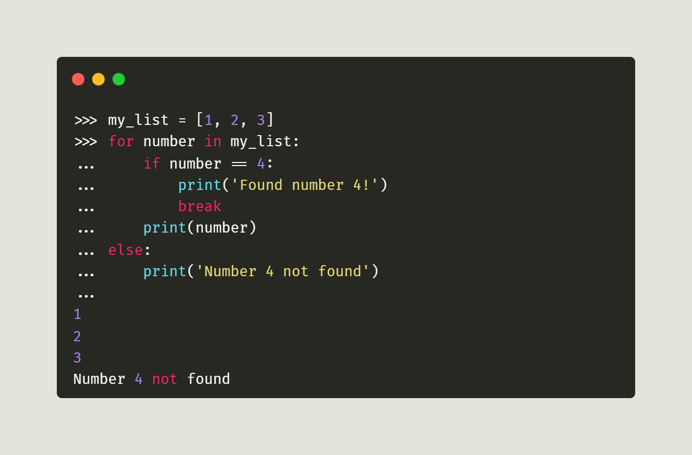 This example loops over a list of three integers. It looks for the number 4 and will break out of the loop if it is found. If that number is not found, then the else statement will execute and let you know.