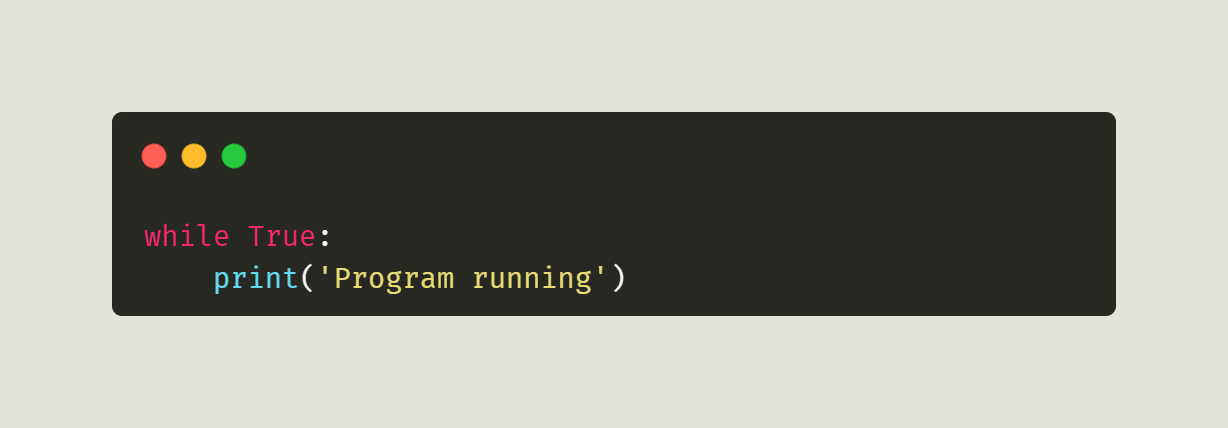 Since the expression is always True, this code will print out the string, “Program running”, forever or until you kill the process.