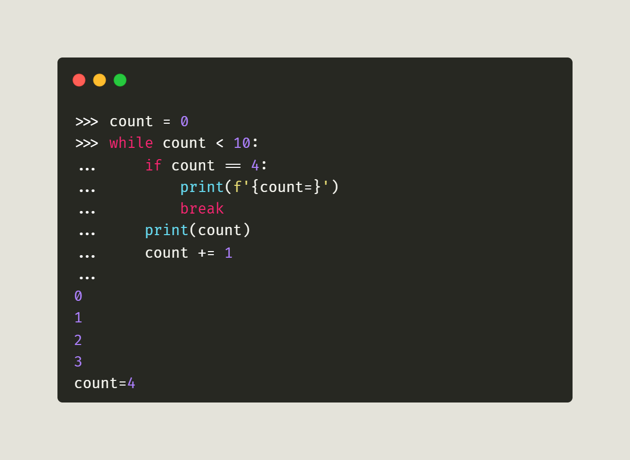In this example, you want the loop to stop when the count reaches 4. To make that happen, you add a conditional statement that checks if count equals 4. When it does, you print out that the count equals 4 and then use the break statement to break out of the loop. (Remember that the trailing “=” in f’{count=}’ requires Python 3.8; in earlier versions, you would need to write f’count={count}’.)
