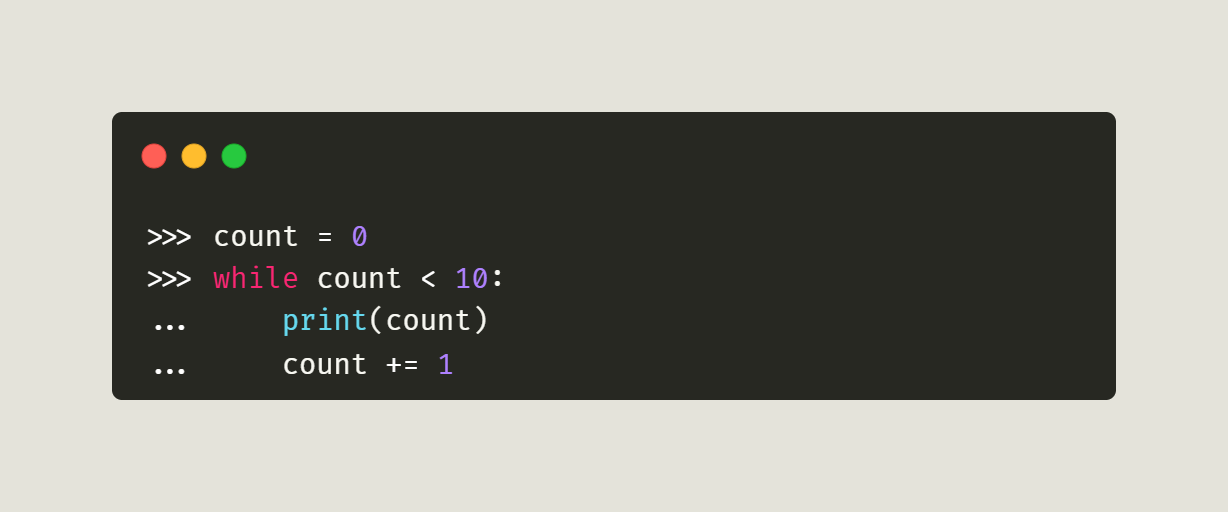This loop is formulated in much the same way as a conditional statement. You tell Python that you want the loop to run as long as the count is less than 10. Inside of the loop, you print out the current count and then you increment the count by one.