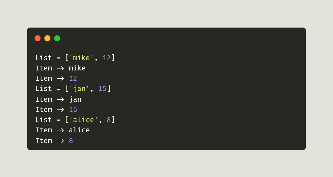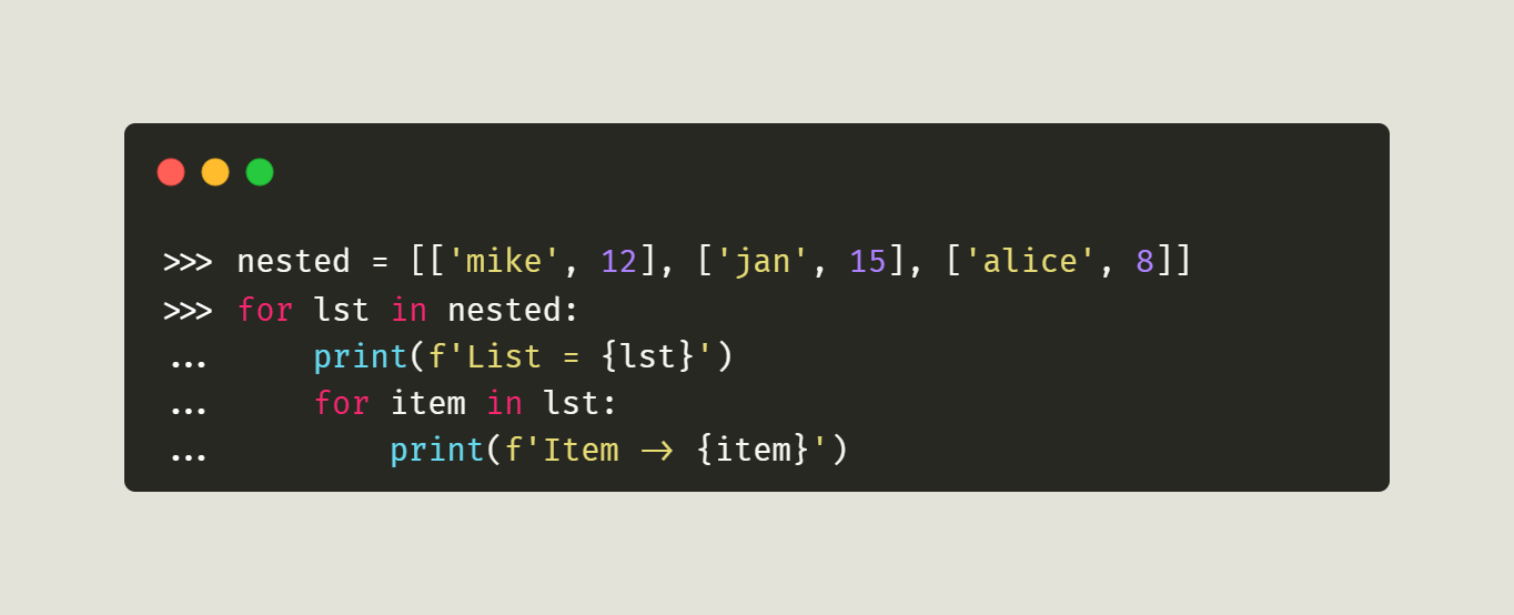The outer loop will extract each nested list and print it out as well. Then in the inner loop, your code will extract each item within the nested list and print it out.