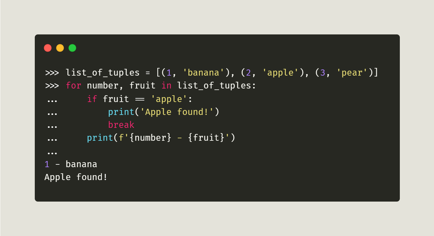 For this example, you want to break out of the loop when you find an apple. Otherwise you print out what fruit you have found. Since the apple is in the second tuple, you will never get to the third one.