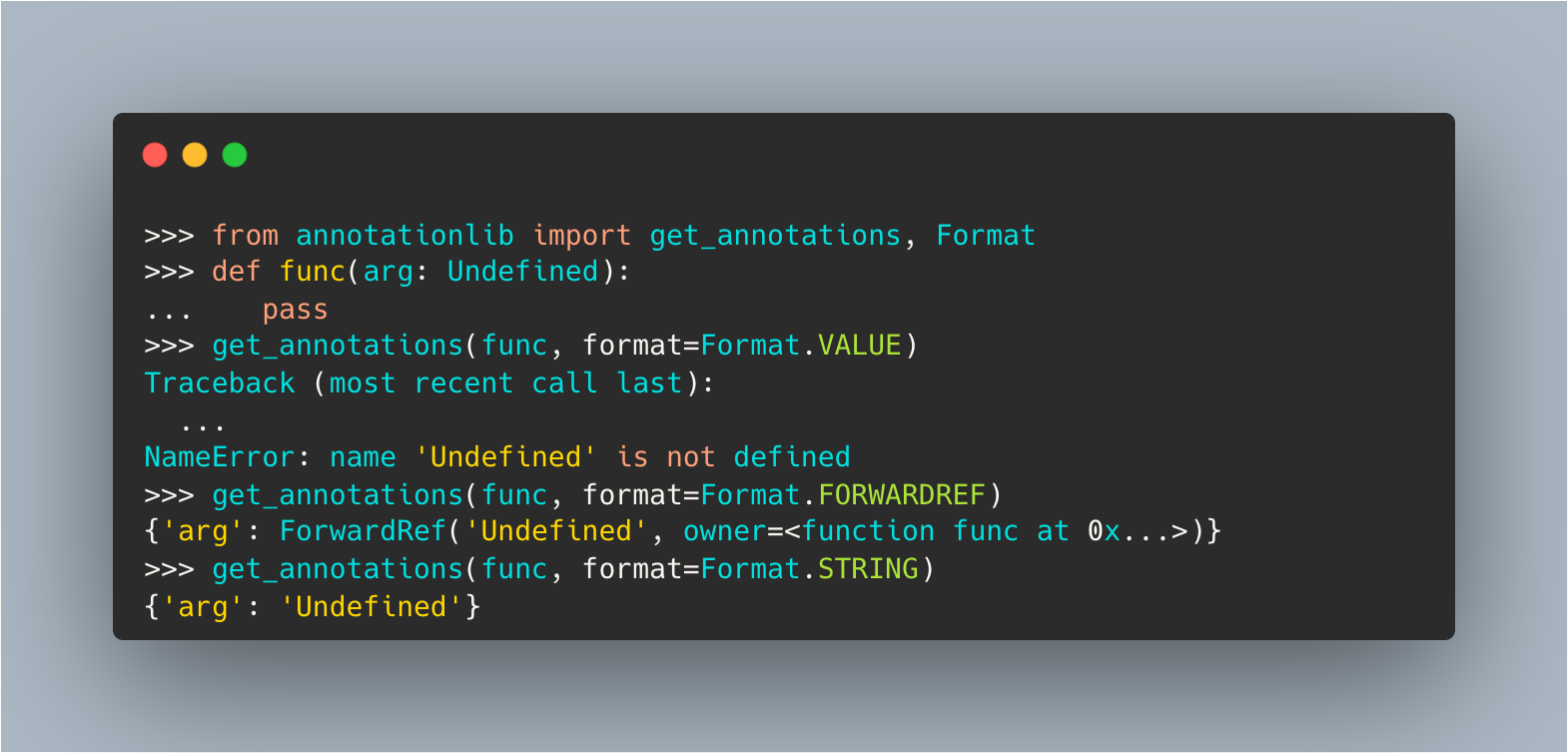Let’s talk about the top three a little. Deferred evaluation of annotations refers to type annotations. In the past, the type annotations that are added to functions, classes, and modules were evaluated eagarly. That is no longer the case. Instead, the annotations are stored in special-purpose annotate functions and evaluated only when necessary with the exception of if from __future__ import annotations