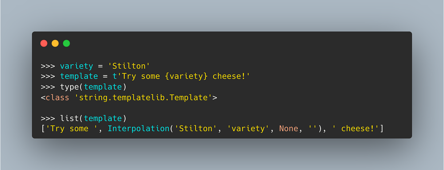 Another feature to highlightare the template string literals (t-strings). Full details can be found in PEP 750. Brett Cannon, a core developer of the Python language, posted a good introductory article about these new t-strings on his blog. A template string or t-string is a new mechanism for custom string processing. However, unlike an f-string, a t-string will return an object that represents the static and the interpolated parts of the string.