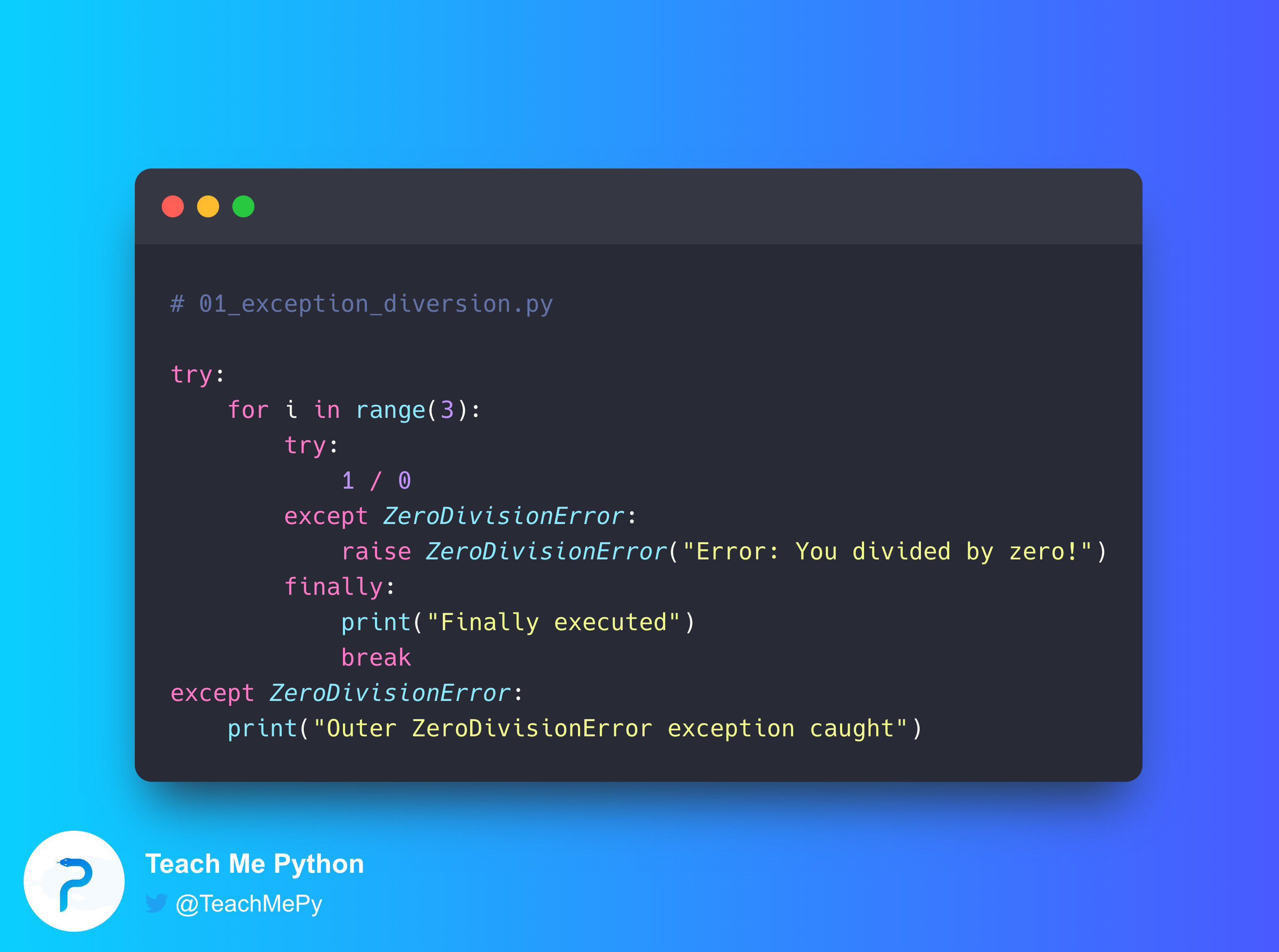 The Python programming language allows you to catch exceptions using the try / except construct. But what happens if you nest exception handlers and throw in a break statement too?
