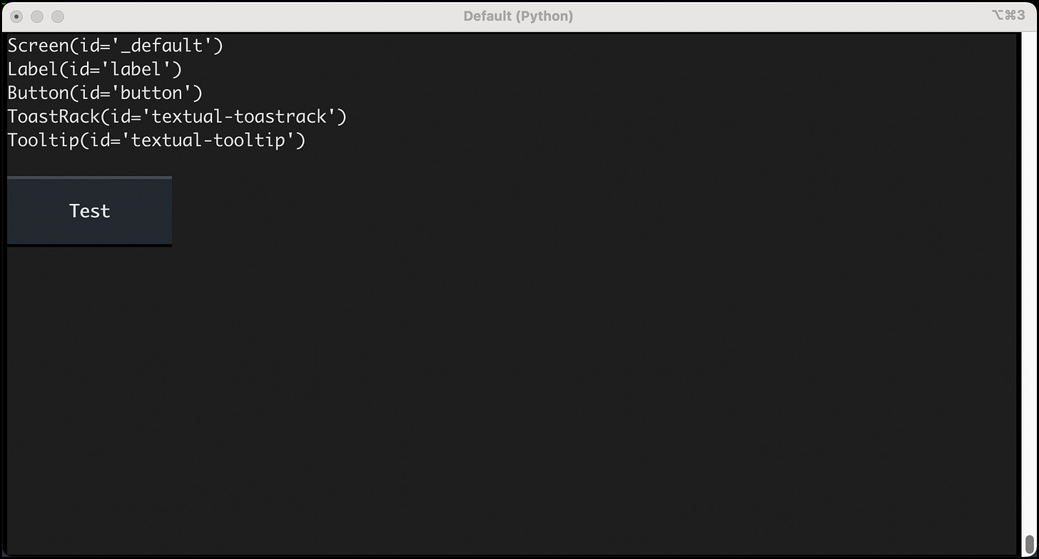 The idea is to get all the widgets in your application and print them out. Of course, you can’t print out anything when your terminal application is blocking stdout, so instead, you create a string of widgets separated by new lines and update the Label widget.