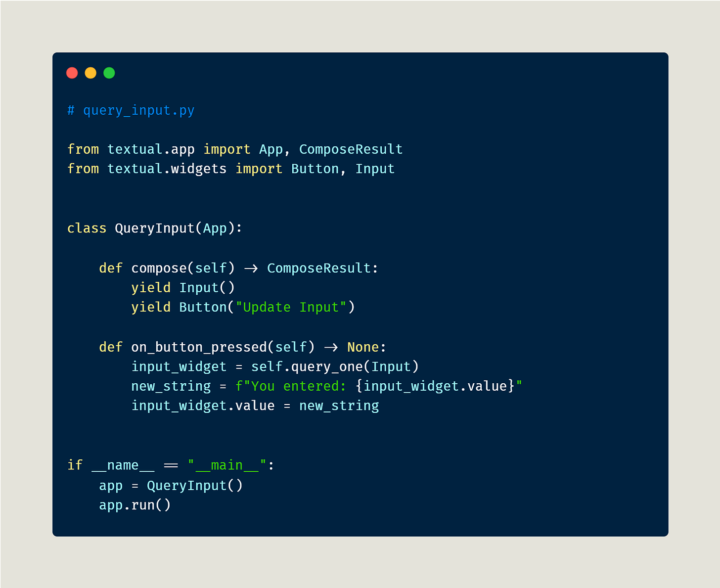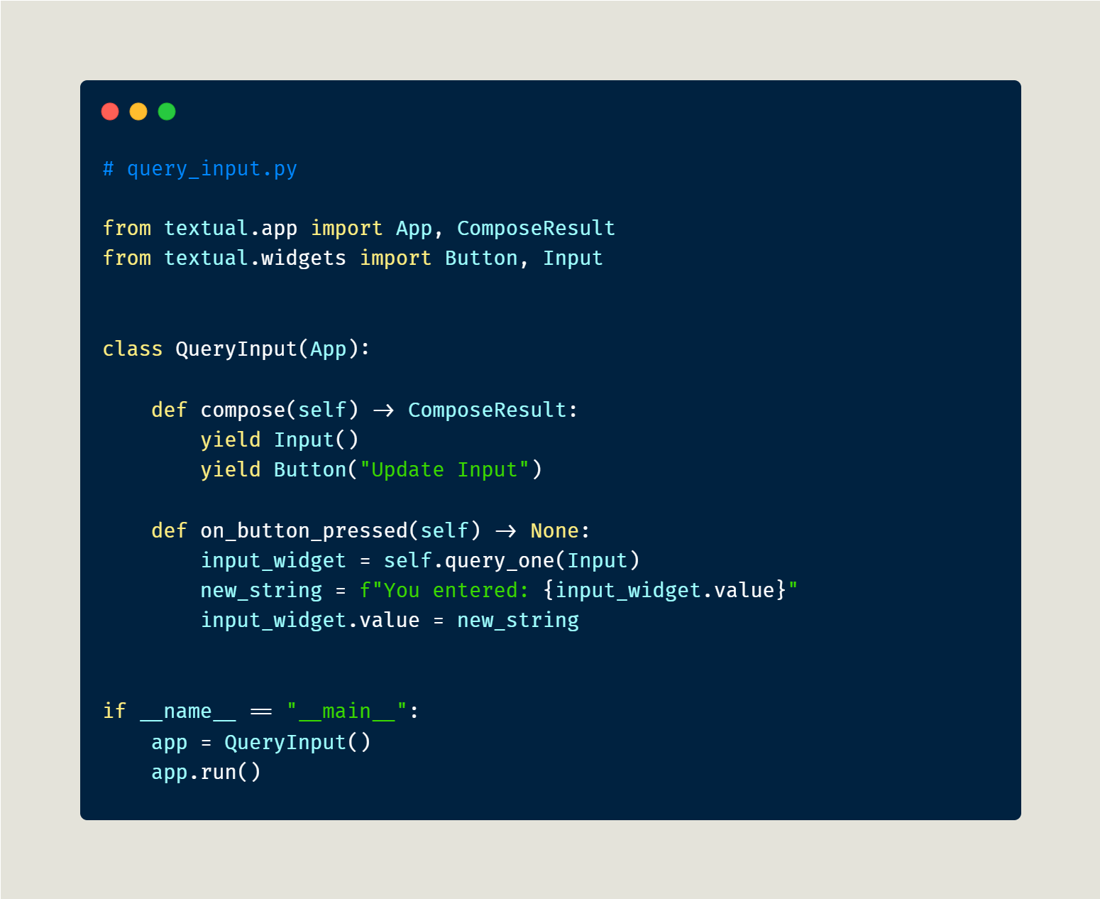 Your code creates an Input and a Button widget. Enter some text in the Input widget and press the button. Your on_button_pressed() method will get called. You call query_one() and pass it an Input widget. Then, you update the returned Input widget’s value with a new string.