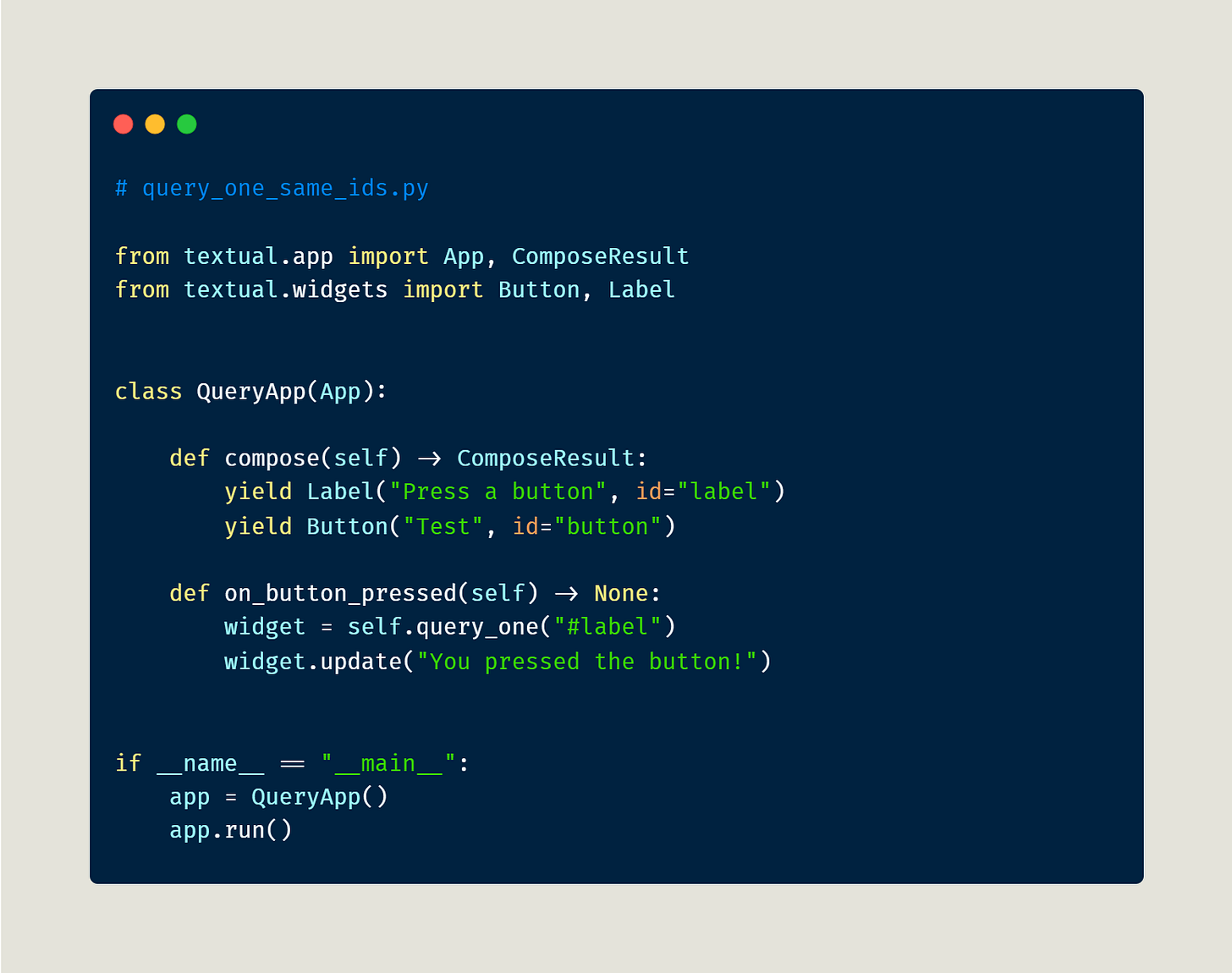 In this example, you create two widgets with different IDs. Then you use query_one() to select the Label widget and update its text.