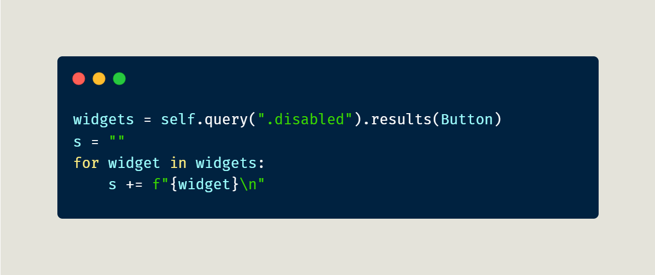 The query objects in Textual also provide a results() method that you can use as an alternative way of iterating over the widgets. For example, you can use results() to rewrite the query above that would retrieve all the disabled buttons to be something like this: