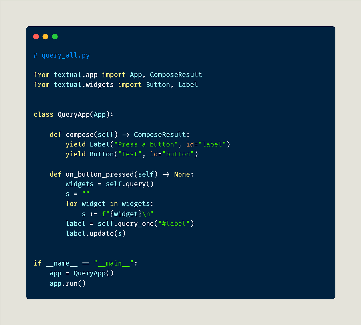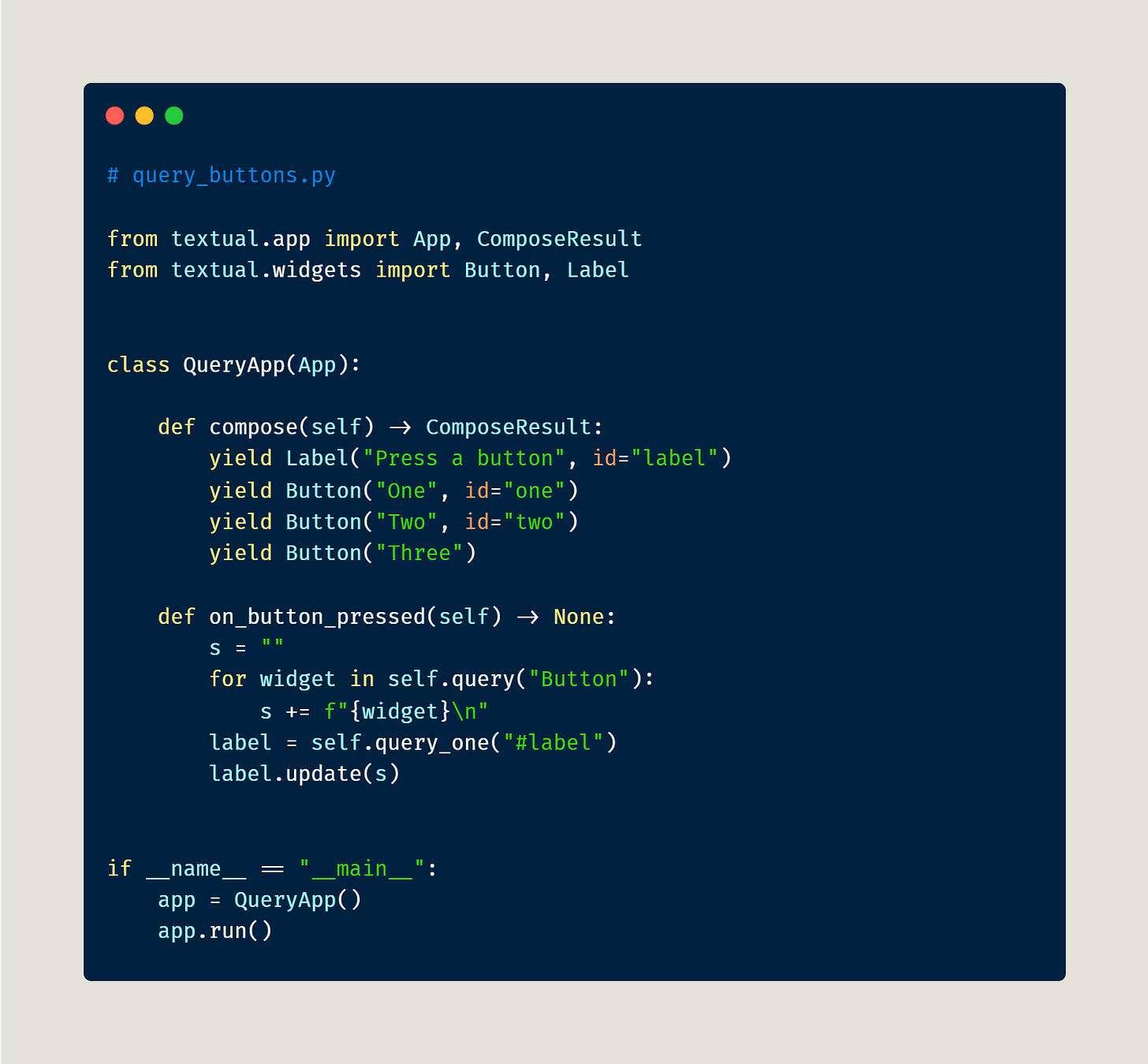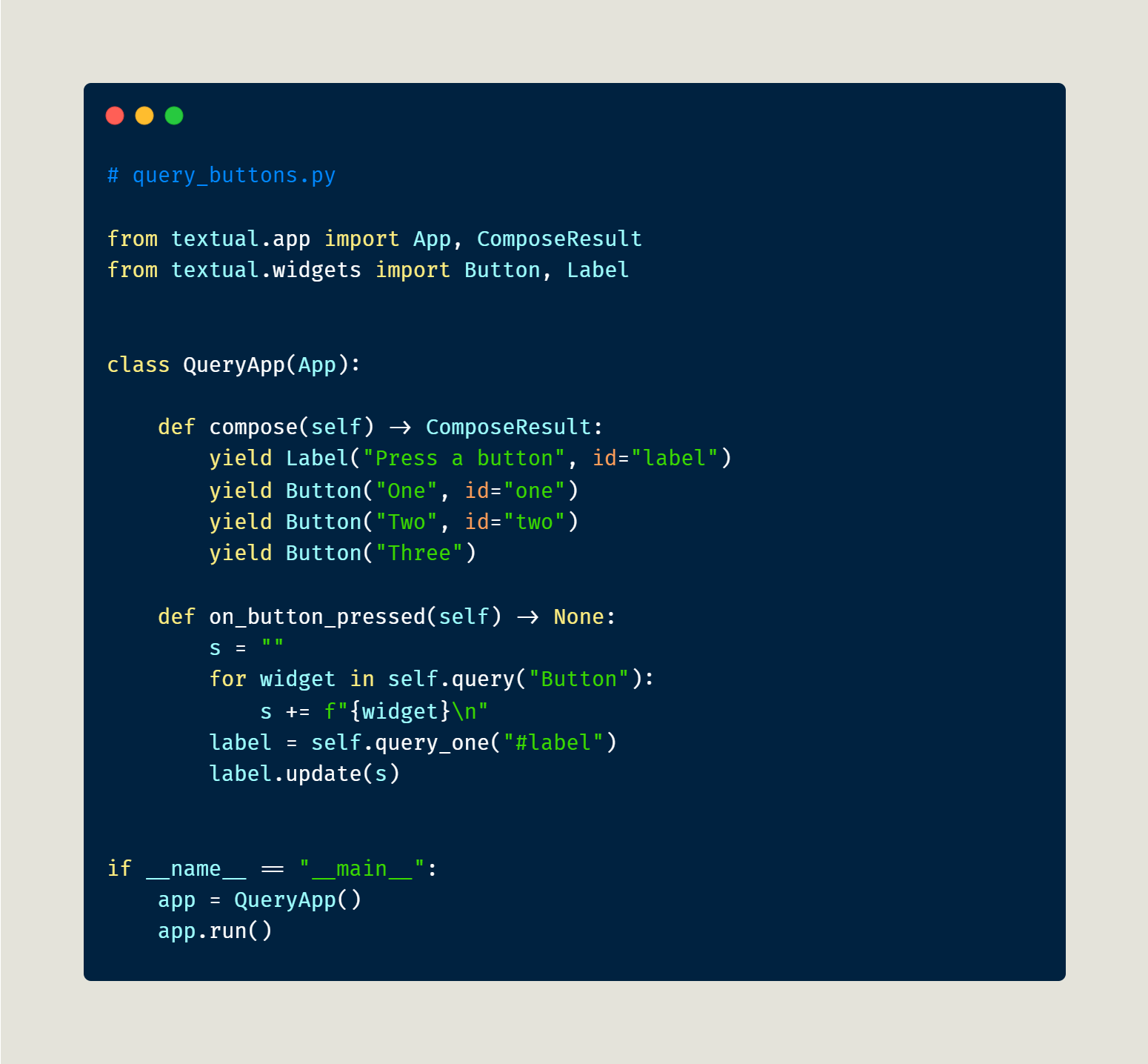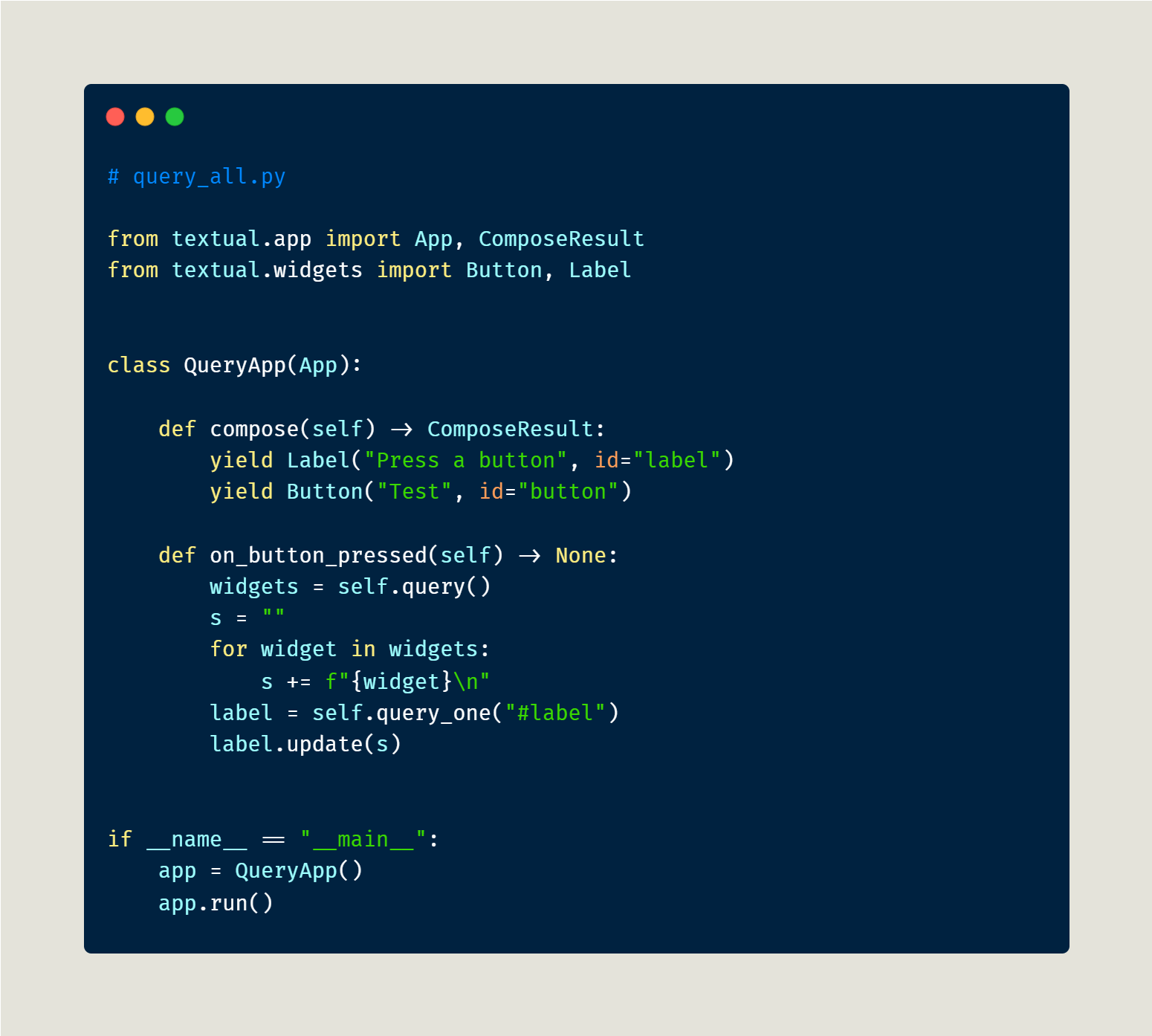 Here you are passing in a string, "Button", to query(). If using query_one, you would use the Button type directly. Regardless, when you run this code and press the button, you will see the following: