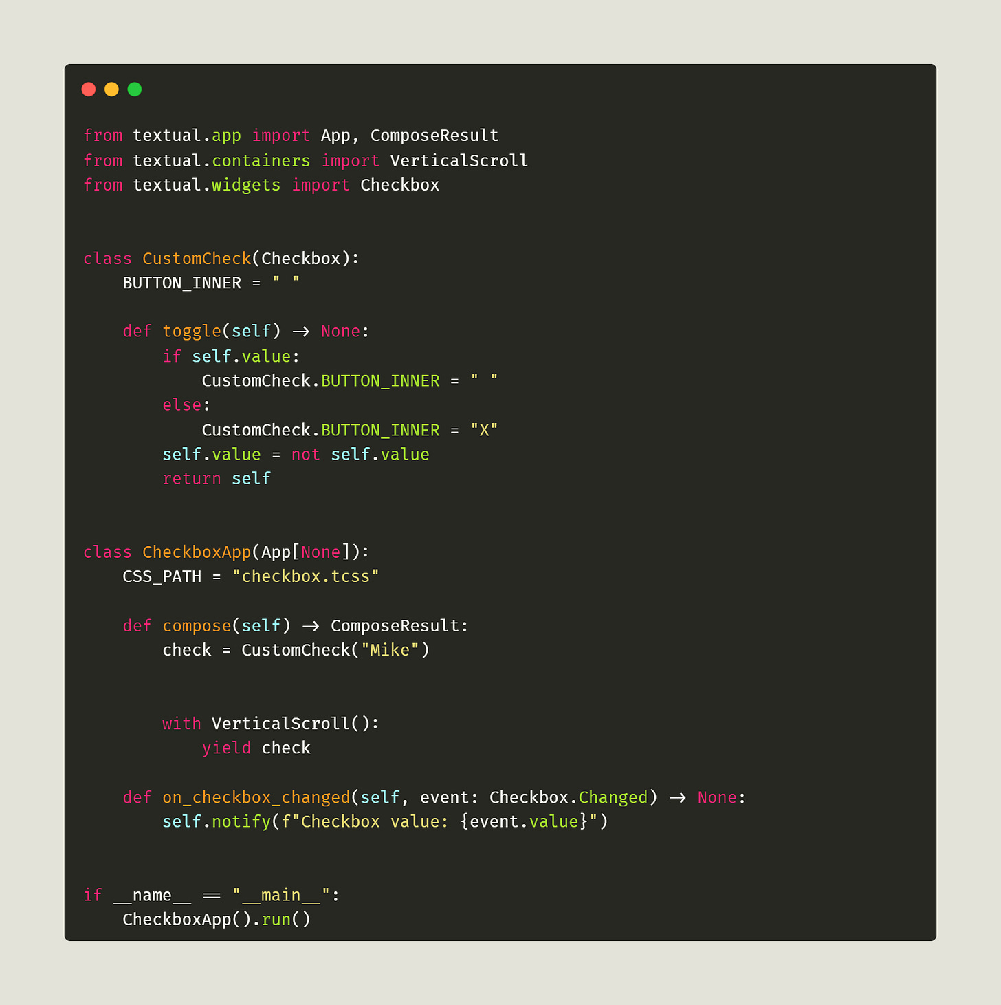 When you want to customize a pre-existing widget in Textual, you will almost always subclass it. So here, you subclass the Checkbox class to create a new CustomCheck class. Next, you override the BUTTON_INNER class attribute as well as the toggle() method.